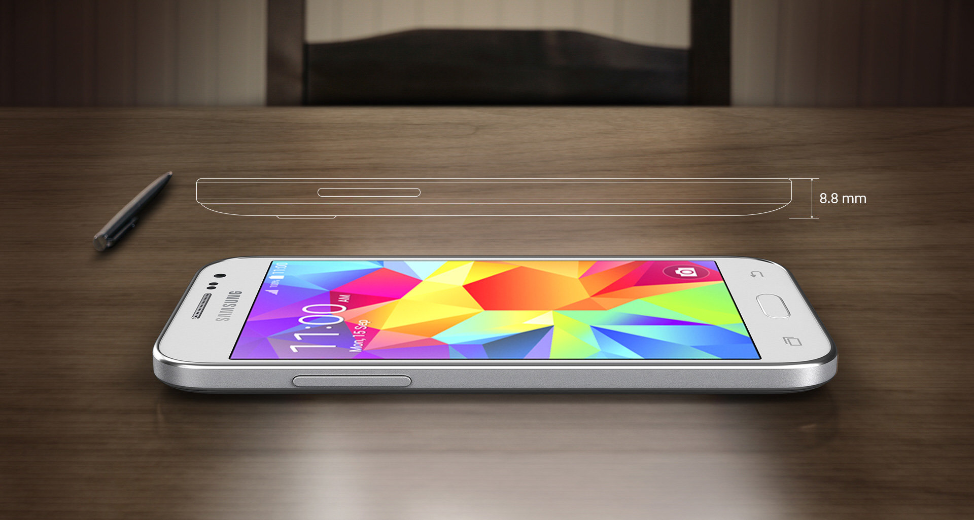 Stonowane wzornictwo Proste i jednocześnie eleganckie wzornictwo, wzmocnione wytrzymałą, przypominającą anodowany metal ramką - taki właśnie jest Galaxy Core Prime. Ma przy tym tylko 8,8 mm grubości, dzięki czemu korzystanie z niego to prawdziwa przyjemność. |