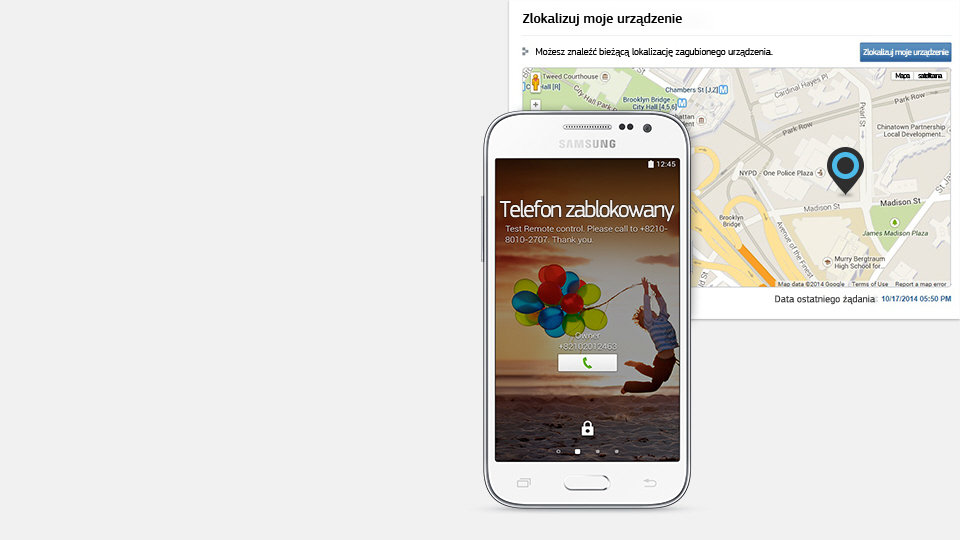 Znajdź Mój Telefon Funkcja Znajdź Mój Telefon to wbudowane fabrycznie zabezpieczenie Twojego smartfona. Jeśli zgubisz swój telefon lub zostaniesz okradziony, możesz przez internet śledzić jego lokalizację, wywołać alarm dźwiękowy, zablokować go lub usunąć najcenniejsze dane. Twój Galaxy Core Prime jest bezpieczniejszy dzięki Znajdź Mój Telefon. |