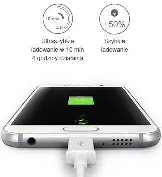 Zapomnij o rozładowanej baterii - Samsung Galaxy S6 ładuje się błyskawicznie, nawet 1,5 raza szybciej, niż poprzednie modele. 10 minut ładowania pozwala na 4 godziny pracy telefonu*.