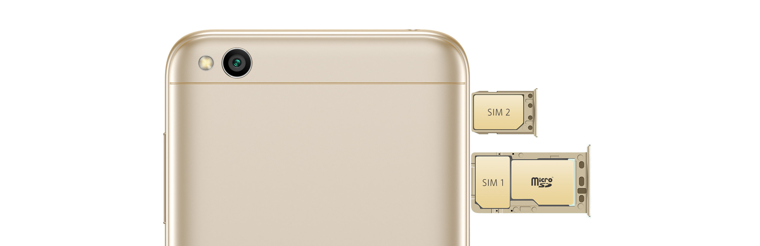 Redmi 5A pozwoli Ci na jednoczesne korzystanie z dwóch kart Nano Sim oraz karty microSD do 128GB.