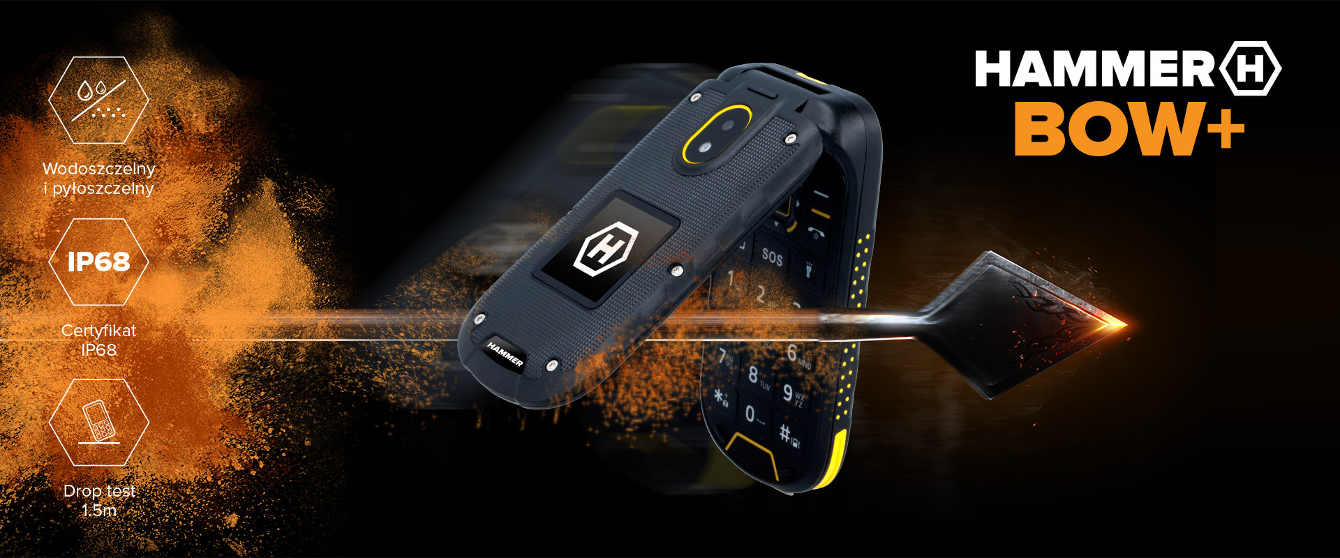 Niezawodny w każdych warunkach Błoto, deszcz, pył - to Twoja codzienność? Świetnie, bo Hammer BOW+ posiada certyfikat IP68*, który sprawi, że sprawdzi się nawet w najtrudniejszych warunkach. Obudowa jest bardziej odporna na wstrząsy i upadki (drop test 1,5 m), a zamknięcie ekranu pod klapką zapewnia mu dodatkową ochronę. *Certyfikat IP 68 oznacza odporność na wodę testowaną przy zanurzeniu do głębokości 1,5 metra, nie dłużej niż na 30 minut oraz pełną ochronę przed wnikaniem pyłu.  |
