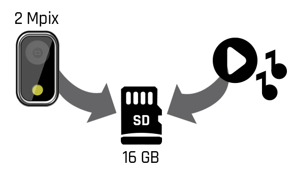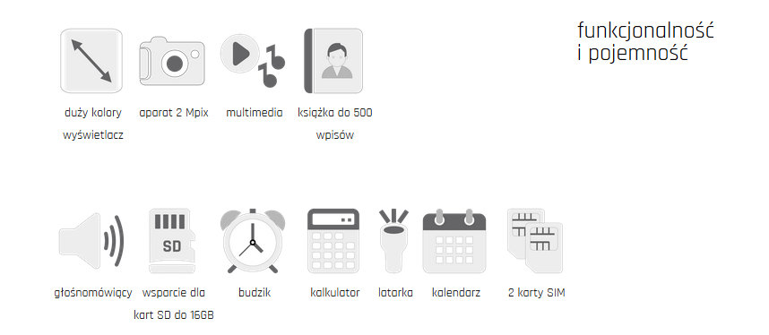 aparat i multimedia zrób zdjęcie aparatem 2 Mpix z tyłu i zapisz je na karcie pamięci MicroSD do 16GB odtwarzaj pliki audio i wideo przy użyciu przeglądarki multimediów |