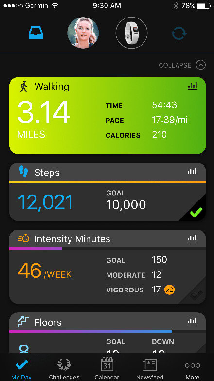 Połącz się i startuj W ciągu dnia vívofit 4 regularnie synchronizuje się z serwisem Garmin Connect. Aplikacja Garmin Connect™ ułatwia bicie własnych rekordów. Przejrzyste, kolorowe karty aktywności zapewniają łatwy dostęp do wszystkich danych. Przesuń w dół, aby łatwo porównać dzisiejsze dane z wcześniejszymi wynikami, lub dotknij ekranu, aby uzyskać szczegółowe informacje. Aktywność i wyniki pomiarów rejestrowane przez urządzenie są przedstawione w przejrzysty i dokładny sposób. A wyświetlane dane są dostosowane do Ciebie i Twojego stylu życia, bez zbędnych dodatków. |