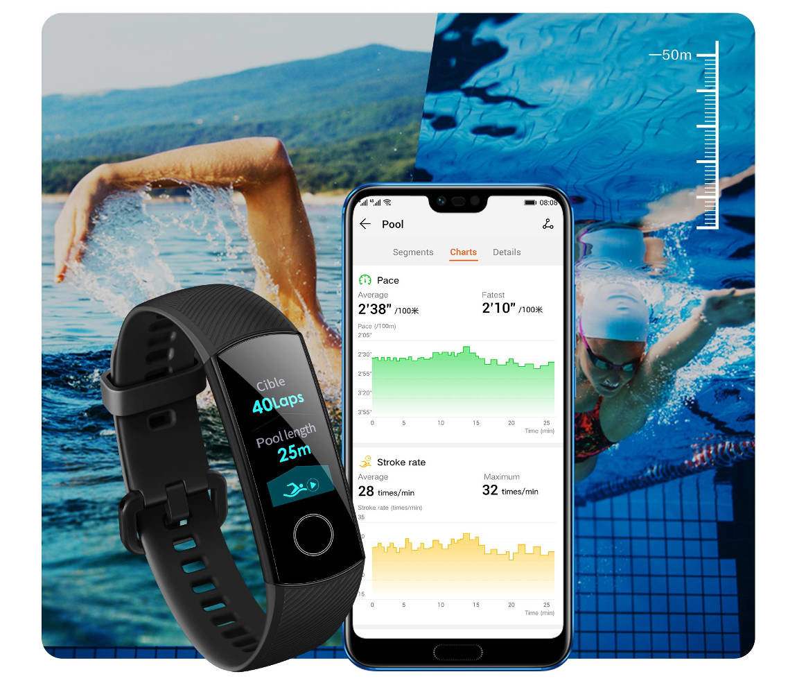 Honor Band 4 pozwala na bezpieczne używanie zegarka podczas sportów wodnych. Wodoodporność 5ATM pozwala na nurkowanie do 50m.