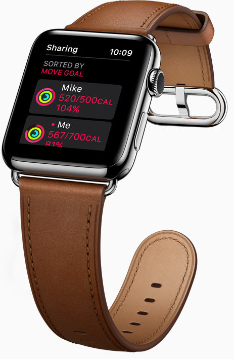 | Udostępnianie aktywności Zdrowie jest zaraźliwe. Możesz porównywać się ze znajomymi, udostępniając im pierścienie apki Aktywność. I ścigać się o to, kto pierwszy osiągnie cele. Z powiadomienia od razu dowiesz się o ich postępach. I nie wychodząc z powiadomienia, odpowiesz. Żeby pokibicować albo zagrać na nosie. |