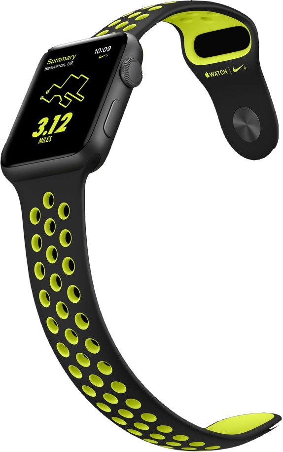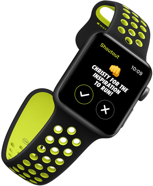Specjalne tarcze Nike. W zaprojektowanych specjalnie dla Apple Watch tarczach Nike użyto kultowego, jaskrawego zielonożółtego koloru Nike, a czas wyświetlany jest w stylu analogowym i cyfrowym. Każda ma także komplikację do uruchamiania apki Nike+ Run Club. |