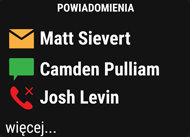 | Bądź na bieżąco Urządzenie vívoactive delikatnie wibruje, informując o powiadomieniach otrzymywanych w zgodnym urządzeniu obsługującym funkcję Bluetooth4. Można zobaczyć identyfikator dzwoniącego i informacje o nieodebranych połączeniach. Wiadomość tekstowa zawiera informacje o nadawcy i treść wiadomości. Wiadomość e-mail zawiera nadawcę i temat. Urządzenie vívoactive wyświetla też powiadomienia z serwisu Facebook®, Twitter® oraz innych serwisów społecznościowych, a także z innych aplikacji mobilnych, w tym ostrzeżenia pogodowe i informacje o temperaturze. Wystarczy dotknąć ekranu i przesunąć po nim palcem, aby wyświetlić więcej informacji lub jednym przyciskiem wyczyścić ekran. |