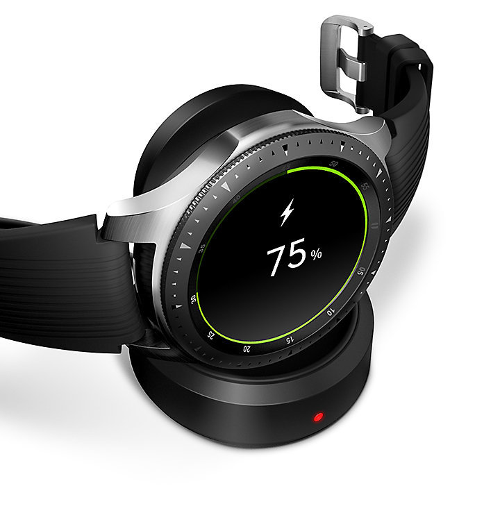 Proste ładowanie Galaxy Watch wystarczy połóżyć na ładowarce bezprzewodowej, a proces ładowania rozpocznie się sam. |