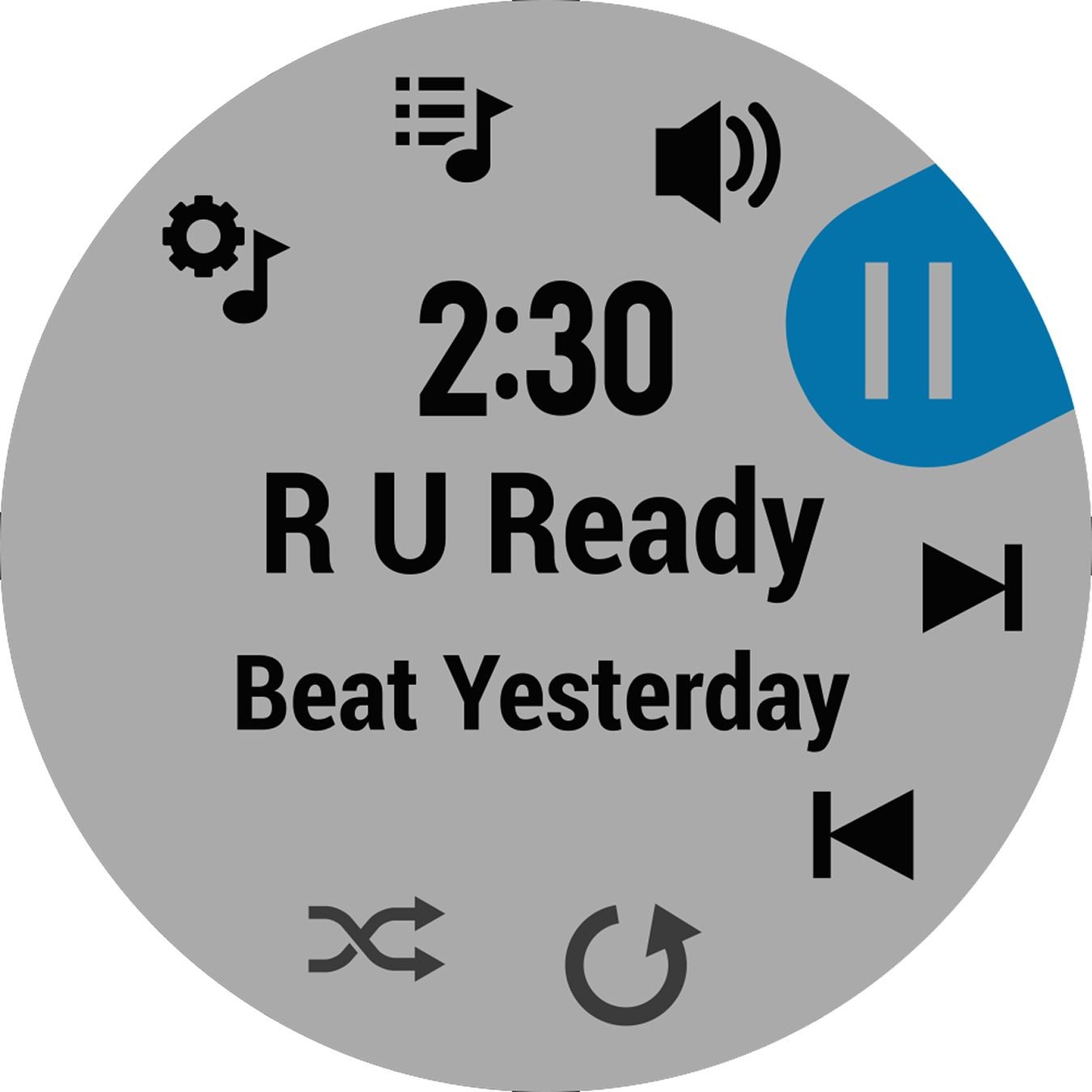 Muzyka motywacyjna Masz jakiś utwór, który nakręca Cię przed wyścigiem lub ciężkim treningiem? Korzystając z fēnix 5S Plus, możesz słuchać muzyki, więc telefon może zostać w domu (pamięć zegarka pomieści do 500 utworów). Pobieranie utworów i tworzenie list odtwarzania z ulubionymi kawałkami jest proste. Możesz więc słuchać muzyki przez bezprzewodowe słuchawki Bluetooth (sprzedawane osobno) w każdym miejscu i czasie. |