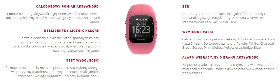Wszystko się liczy Liczy się każdy Twój krok, skok i bieg. A300 wyświetla liczbę kroków, przebyty dystans i spalone kalorie, motywując Cię do osiągania celów związanych z aktywnością. Jeśli zbyt długo siedzisz, A300 wibracjami daje znać, że czas się ruszyć. |