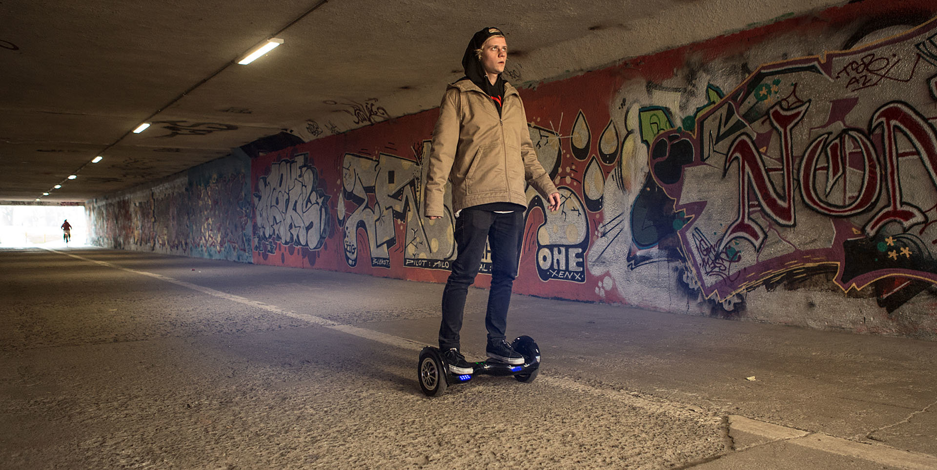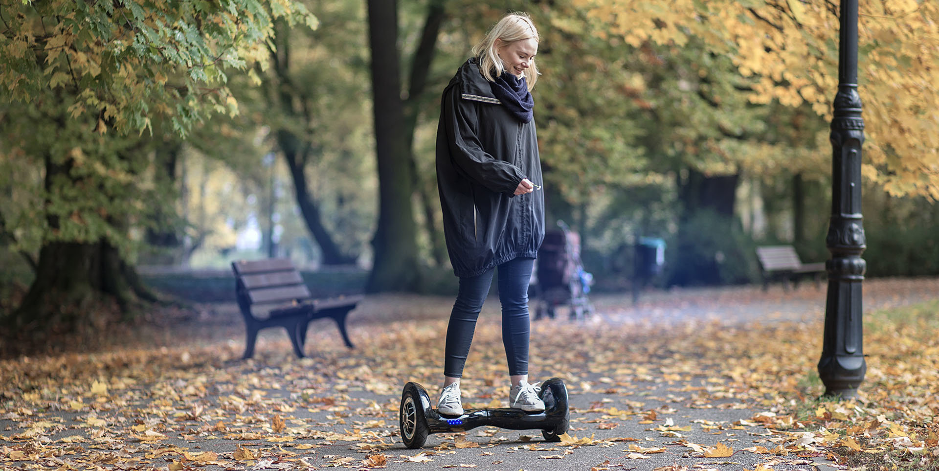 - jedziesz stojąc! Użytkownik może sam kontrolować pojazd - przyspieszać, zwalniać, hamować, skręcać, itd. - przez pochylanie się do przodu i do tyłu oraz odpowiednią pracę stóp.
