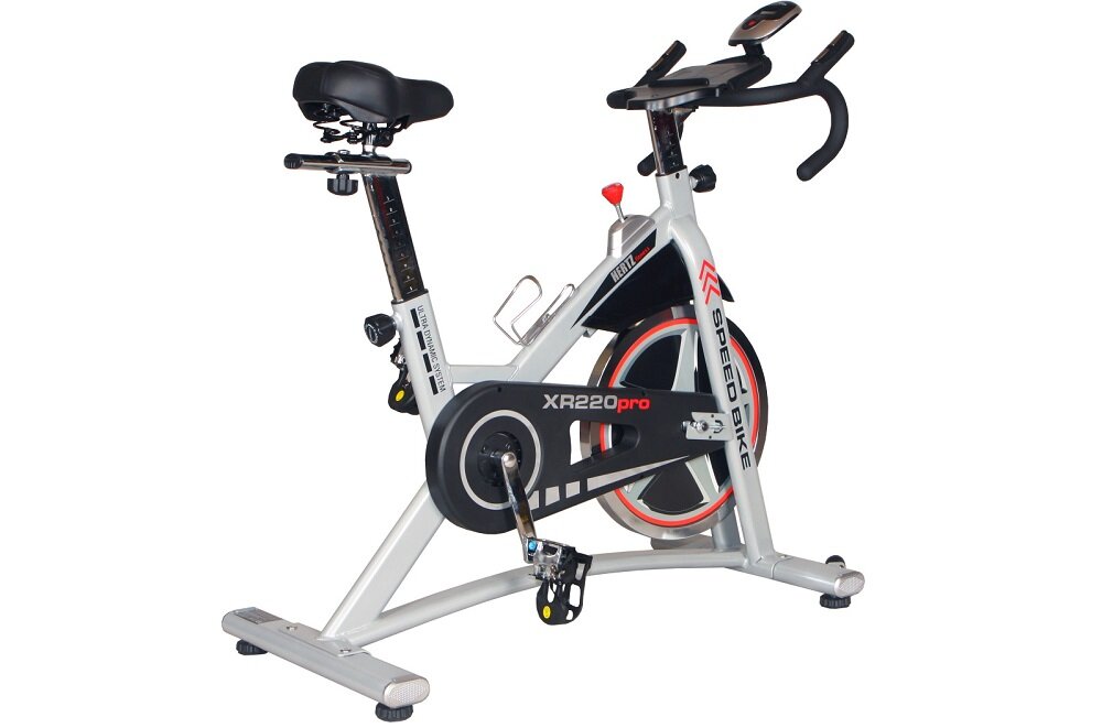 Rower spiningowy XR-220 Pro to dobry rower zarówno dla początkujących jak i średniozaawansowach użytkowników. 20 kg koło zamachowe posiada odpowiednią bezwładność i zapewnia utrzymanie odpowiedniego rytmu pedałowania i kadencję. Hamulec dociskowy w tym modelu pozwoli na zwikszenie oporu i efektywny trening na stojąco. Dzięki temu rower tenidealnie nadaje się do treningów interwałowych lub treningów cardio. Xr-220 Pro to także kilka detali wyróżniających ten model. Są to między innymi metalowe pedały, sensory pulsu czy rozbudowana kierownica.