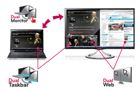 Ta funkcja pozwala w łatwy sposób rozszerzyć obraz na drugi monitor jednocześnie kopiując pasek zadań. Używając tego trybu do przeglądania stron internetowych można jednocześnie przeglądać dwa otwarte obok siebie okna przeglądarki. Każde z okien zostanie automatycznie dostosowane do wielkości połowy ekranu.