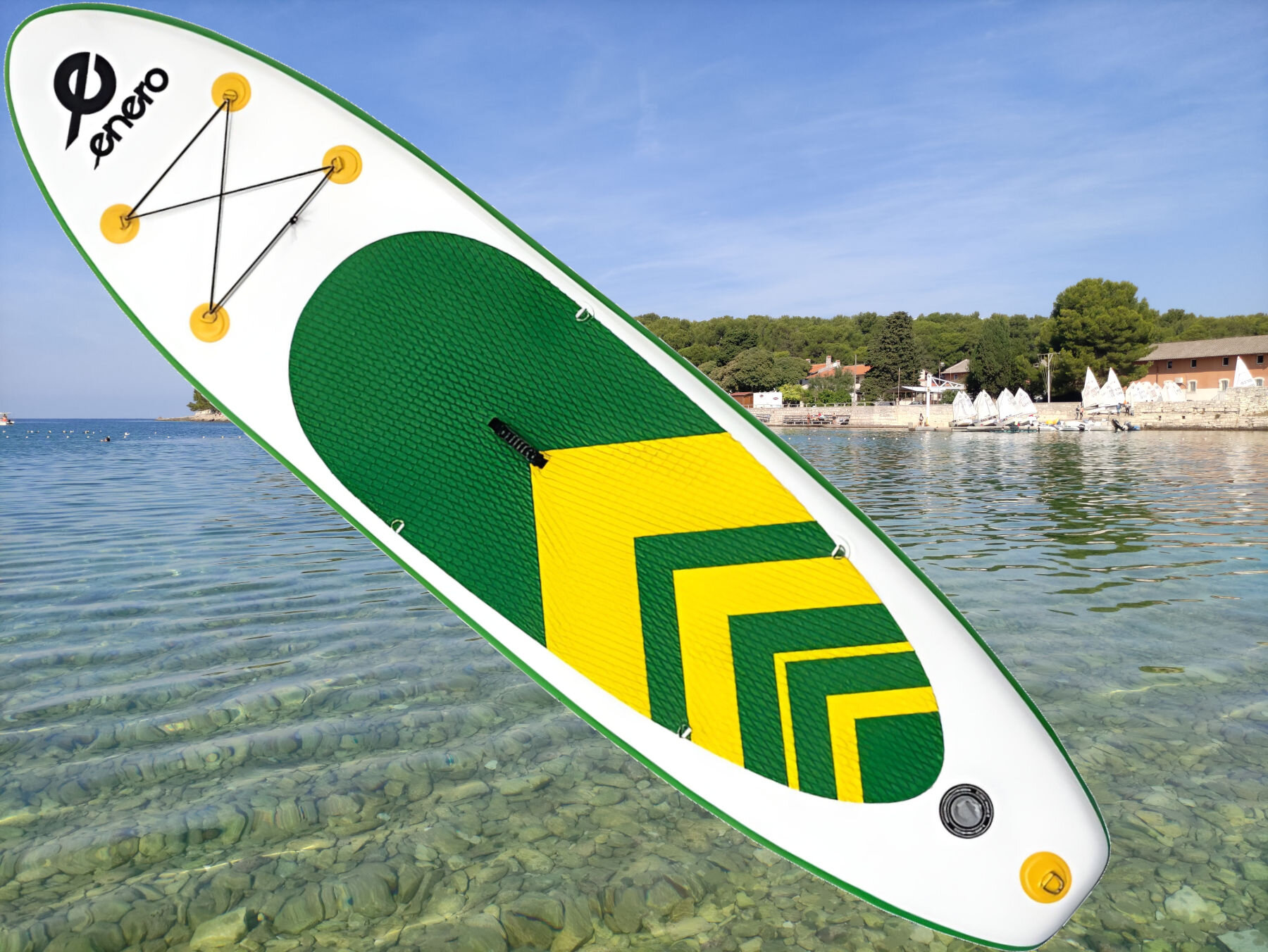 Deska SUP ENERO 1019963 (300 x 76 x 15 cm) o wadze 7,4 kg, składane aluminiowe wiosło, zdejmowana płetwa, pompka ręczna, plecak (88 x 30 x 24 cm), zestaw naprawczy (klej i łatka 3-warstwowa).