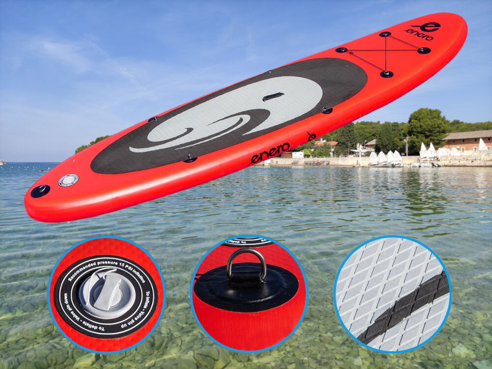 Deska SUP ENERO 1034058 (300 x 76 x 15 cm) o wadze 7,4 kg, składane aluminiowe wiosło, zdejmowana płetwa, pompka ręczna, plecak (88 x 30 x 24 cm), zestaw naprawczy (klej i łatka 3-warstwowa).