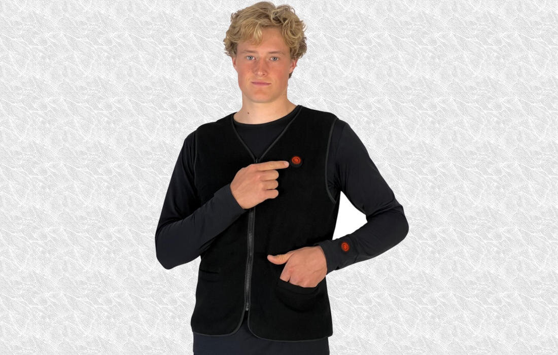 Z przodu i z tyłu kamizelki znajduje się element grzewczy, co gwarantuje równomierne rozprowadzanie ciepła. Waga kamizelki bez baterii wynosi 250g, natomiast waga z baterią to 440g.