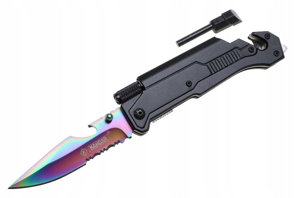 NÓŻ Składany Ratowniczy SURVIVALOWY Scyzoryk 7w1 Latarka Krzesiwo N535