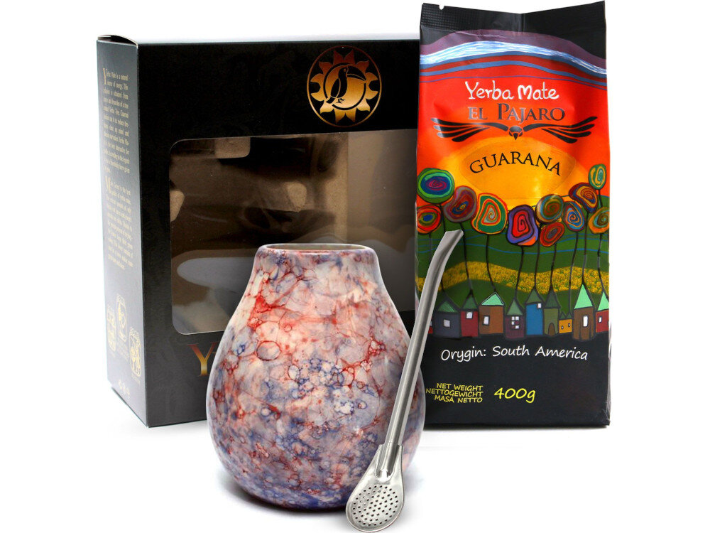 Yerba Mate Green El Pajaro Guarana 400 g, bombilla Liza 19 cm, naczynie Caleidoscop 350 ml, pudełko czarne z wkładką.