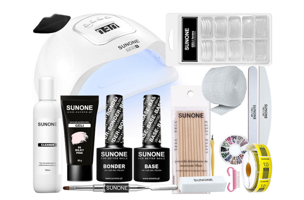 W tworzeniu paznokci żelowych - najważniejszym produktem jest żel UV. W zestawie znajdziesz SUNONE GELI, czyli innowacyjny produkt w kategorii przedłużania i modelowania paznokci. Posiada on specjalną formułę akrylożelu GELI, która daje lekkość i elastyczność żelu oraz trwałość akrylu. Jeśli chcesz mieć idealny kształt paznokcia oraz naturalny efekt - to ten produkt jest dla Ciebie! Z pomocą GELI w szybki i łatwy sposób zabezpieczysz swoje paznokcie przed łamaniem, a także utwardzisz i przedłużysz płytkę paznokciową. GELI to także idealna baza dla stylizacji lakierami hybrydowymi oraz klasycznymi. Żel posiada odcień Milky Pink.