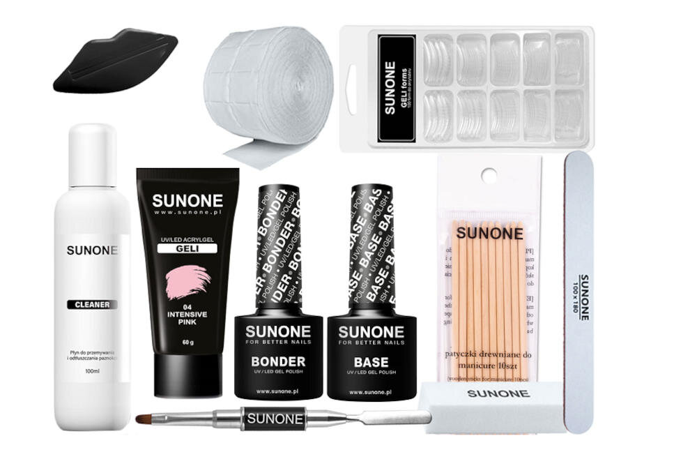 W tworzeniu paznokci żelowych - najważniejszym produktem jest żel UV. W zestawie znajdziesz SUNONE GELI, czyli innowacyjny produkt w kategorii przedłużania i modelowania paznokci. Posiada on specjalną formułę akrylożelu GELI, która daje lekkość i elastyczność żelu oraz trwałość akrylu. Jeśli chcesz mieć idealny kształt paznokcia oraz naturalny efekt - to ten produkt jest dla Ciebie! Z pomocą GELI w szybki i łatwy sposób zabezpieczysz swoje paznokcie przed łamaniem, a także utwardzisz i przedłużysz płytkę paznokciową. GELI to także idealna baza dla stylizacji lakierami hybrydowymi oraz klasycznymi. Żel posiada odcień Intensive Pink.