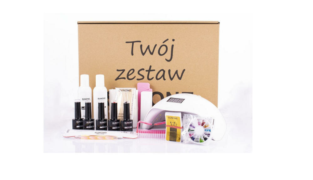 Stwórz salon manicure w swoim domu, dzięki zestawowi do manicure hybrydowego marki SUNONE. Twórz idealne paznokcie nie wychodząc z domu! Połącz produkty z zestawu by tworzyć niesamowite wzory i kolory na paznokciach. Zestaw zawiera produkty potrzebne do wykonania hybryd. Baza SUNONE przeznaczona jest do stosowania na naturalną płytkę paznokcia. Maksymalnie zwiększa przyczepność lakierów hybrydowych do naturalnej płytki paznokcia. Produkt utwardzamy pod lampą UV lub LED. Bazę nakłada się na wcześniej przygotowaną płytkę paznokcia. Oprócz bazy w zestawie znajdziesz Top No Wipe - produkt, który zapewni doskonałą ochronę stylizacji bez konieczności przemywania warstwy po utwardzeniu. Gwarantuje długotrwały i bardzo wysoki połysk i efekt "mokrych paznokci". Potrzebny też jest aceton - preparat stworzony do usuwania hybryd. Pozwoli szybko i bezpiecznie zdjąć hybrydę - rozpuści lakier i ułatwi jego usunięcie. Jest też Cleaner - preparat, który odtłuszcza i dezynfekuje płytkę paznokcia oraz usuwa lepką warstwę żelu. Kolejnym elementem zestawu jest wygodny pędzelek i szpatułka do nakładania żelu. I najważniejsze - w zestawie znajdziesz 3 lakiery hybrydowe - B01 Blanka, C12 Carly, Czarna Inez.