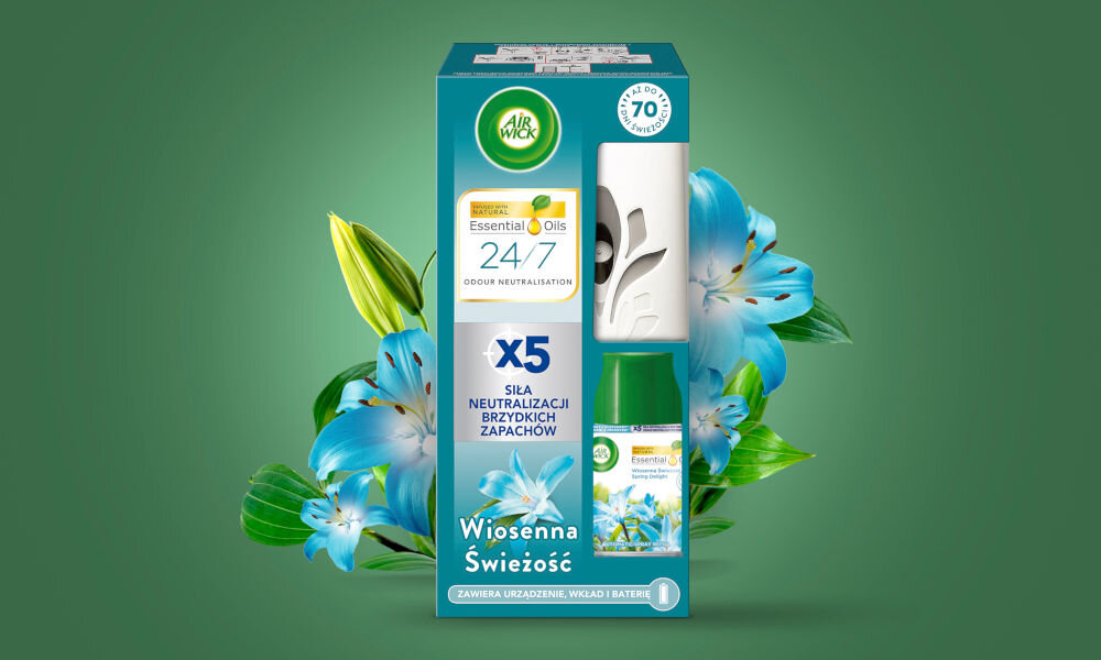 Pozbądź się nieprzyjemnych zapachów i spraw, by w Twoim domu zagościł zapach rozkwitających kwiatów. Świeży aromat wprowadzi przytulną atmosferę i podkreśli uczucie czystości. Zapach Air Wick Freshmatic Wiosenna Świeżość to część specjalnej kolekcji, której formuła nie zawiera wody. Zapach unosi się w powietrzu i nie osiada na skórze czy ubraniach.