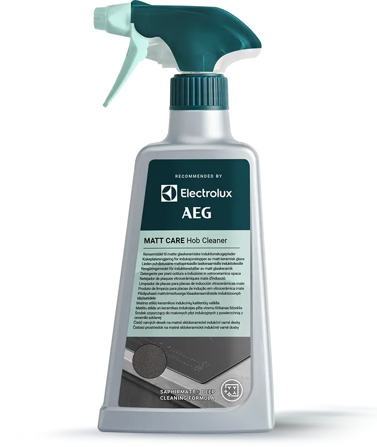 Środek czyszczący Matt Care specjalnie stworzony do mycia płyt indukcyjnych ze szkła ceramicznego, takich jak SaphirMatt® i SaphirMatt® SE*. Bez śladu usuwa oporny tłuszcz i przypalone resztki jedzenia.