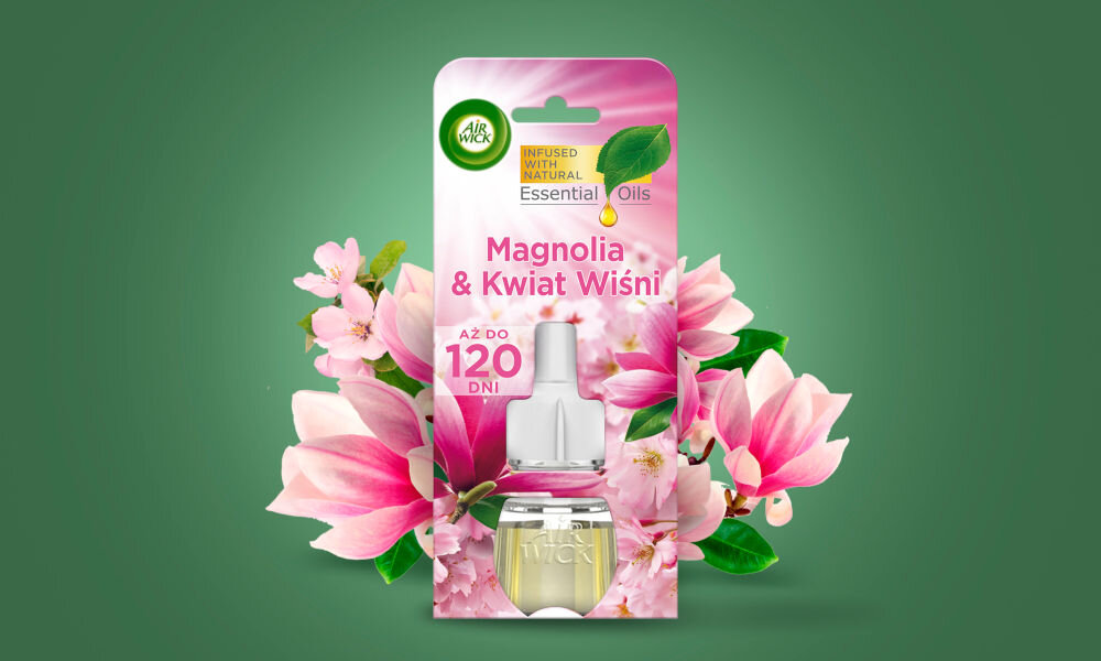 Wypełnij swoje wnętrze niezwykłym połączeniem rozkwitającej magnolii i kwiatów wiśni za pomocą wkładu do elektrycznego odświeżacza powietrza AIR WICK o zapachu Magnolia i Kwiat Wiśni. Jego bogaty aromat zostawi długotrwały ślad świeżości w Twoim domu. Ten zapach pochodzi z kolekcji Essential Oils, gdzie kompozycje zapachowe czerpią inspirację z naturalnych esencji owoców, kwiatów i roślin, tworząc wyjątkową atmosferę w Twoim wnętrzu.