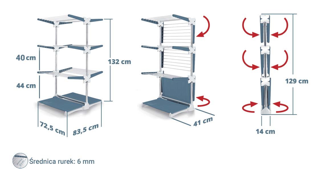 Suszarka Meliconi Junior zajmuje na podłodze prawie dwa razy mniej miejsca, niż klasyczne, druciane suszarki do ubrań, mieszcząc przy tym aż dwukrotnie więcej prania. Dodatkowo, dzięki piętrowej konstrukcji suszarki, gwarantującej swobodny przepływ powietrza, Twoje ubrania będą schnąć dużo szybciej.