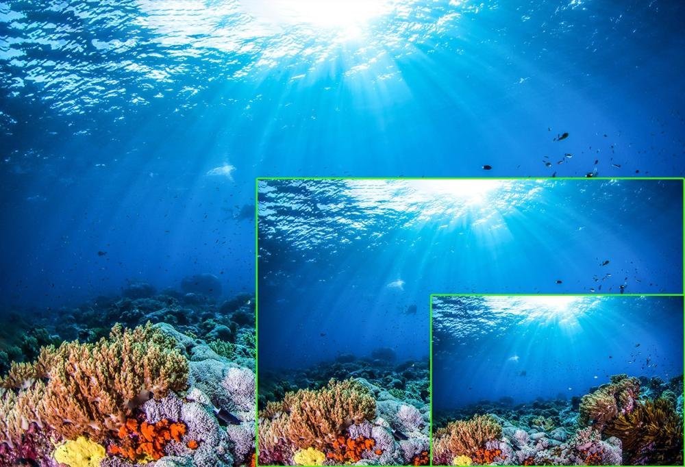 Upscaling polega na wypełnieniu wolnych przestrzeni pomiędzy pikselami w materiale z niższą rozdzielczością oraz na rozciągnięciu go tak, aby pasował on do dużego ekranu z większą rozdzielczością. |