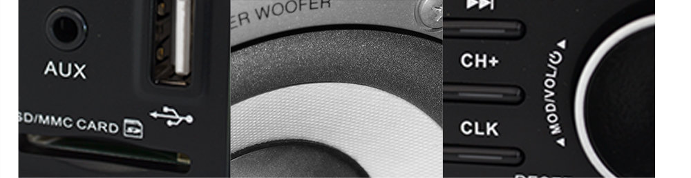 Radio wyposażone jest w wejście USB - umożliwia odtwarzanie plików z pendriva, przenośnych dysków twardych lub playerów Mp3. Wejście SD / MMC umożliwia odtwarzanie plików zapisanych na popularnych kartach pamięci. Wejście antenowe do podłączenia zewnętrznej anteny radiowej. Dzięki zastosowaniu podświetlenia LED uzyskano bardzo dobrej jakości kontrast oraz barwę kolorów. W przypadku dłuższego przytrzymania przycisku CLK - każde następne naciśnięcie pozwala wybrać kolor podświetlenia ekranu ( czerwony , niebieski, zielony ).