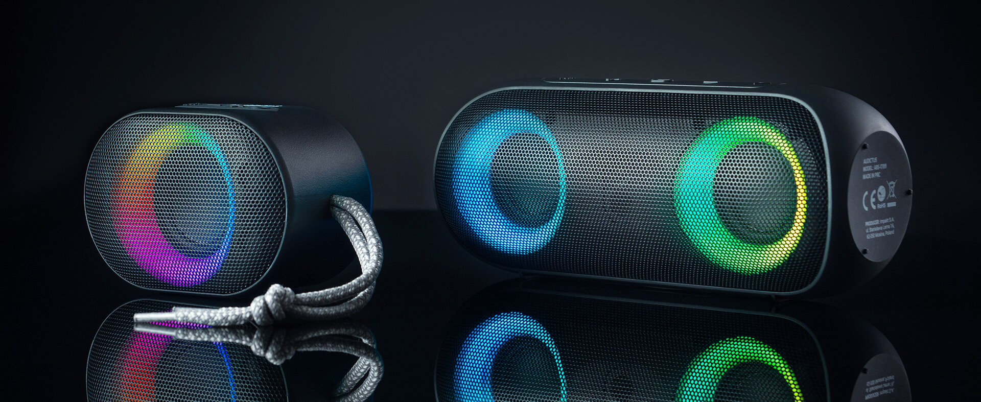 Na froncie głośnika znajdują się dwa kolorowe pierścienie RGB, które dzięki żywym kolorom i 9 trybom podświetlenia idealnie dopasują się do stylu każdej imprezy i zapewnią słuchaczom niezapomniane wrażenia wizualne.