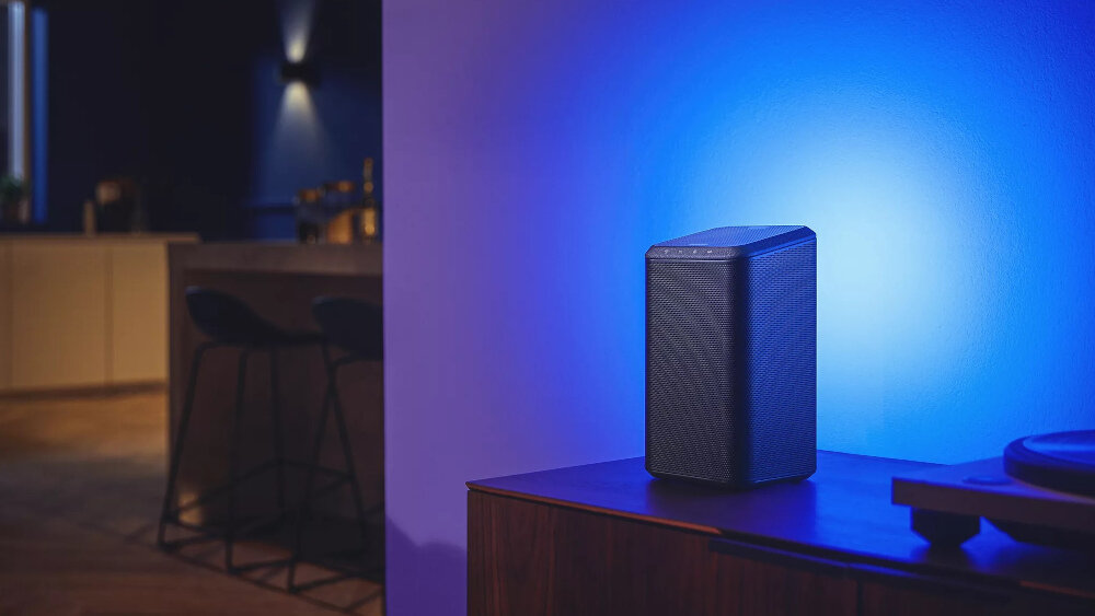 Głośnik PHILIPS Fidelio TAFS1/10 współpracuje z telewizorami Philips Ambilight. Możesz dzięki temu nie tylko odtwarzać z jego pomocą muzykę, ale i korzystać z funkcji Ambilight. Połącz się bezpośrednio z telewizorem, naciskając przycisk Ambilight na swoim głośniku, a od razu będziesz mógł cieszyć się ze zdecydowanie głębszego dźwięku i efektów, jakie usłyszysz podczas grania w swoje ulubione gry na konsoli, słuchania muzyki czy oglądania telewizora.