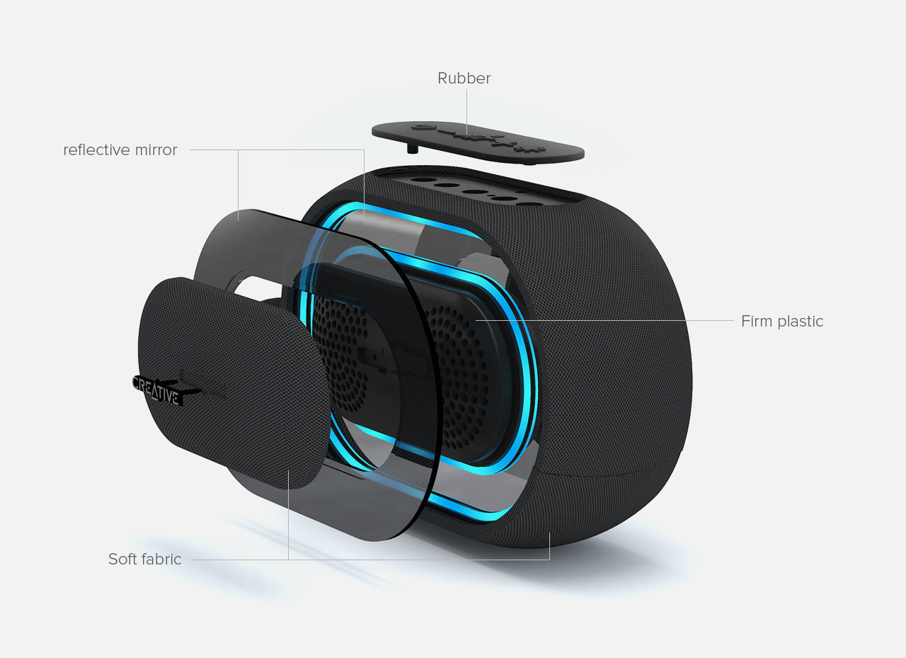 Miły w dotyku materiał, z którego wykonano głośnik Creative Halo, elementy sterujące pokryte gumą, twarde tworzywo sztuczne i błyszczące wykończenie powierzchni w połączeniu ze świetlnym show tworzą produkt, który jest zarówno futurystyczny, jak i minimalistyczny. |