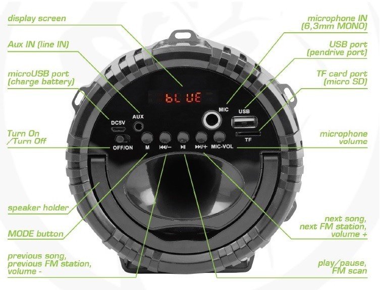 AUX, Karaoke.Posiada wbudowany akumulator 800mAh (ładowany z micro
