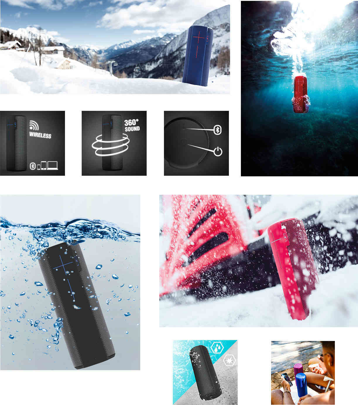 WODOSZCZELNOŚĆ ZGODNIE Z NORMĄ IPX7 Świetna ochrona przed wodą. Nawet jeśli upuścisz urządzenie do wody na pół godziny na głębokość do 1 metra, głośnik MEGABOOM będzie ciągle działał.