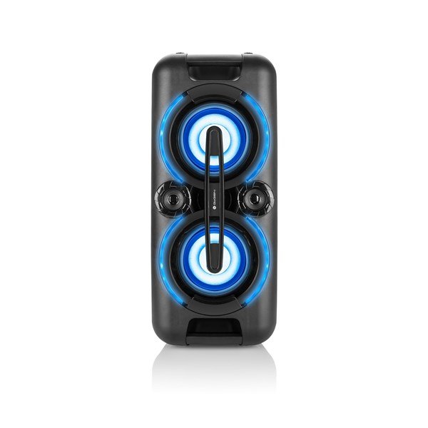 Przez głośnik party speaker można słuchać radia z cyfrowym tunerem FM z pamięcią 30 stacji, słuchać muzyki w formacie MP3. Akumulator ma energię na około 4 godzin przy maksymalnej głośności, więc jeśli nie słuchasz muzyki na całego, wytrzyma dziesiątki godzin. Dla radia i innych funkcji służy wyświetlacz LCD. |