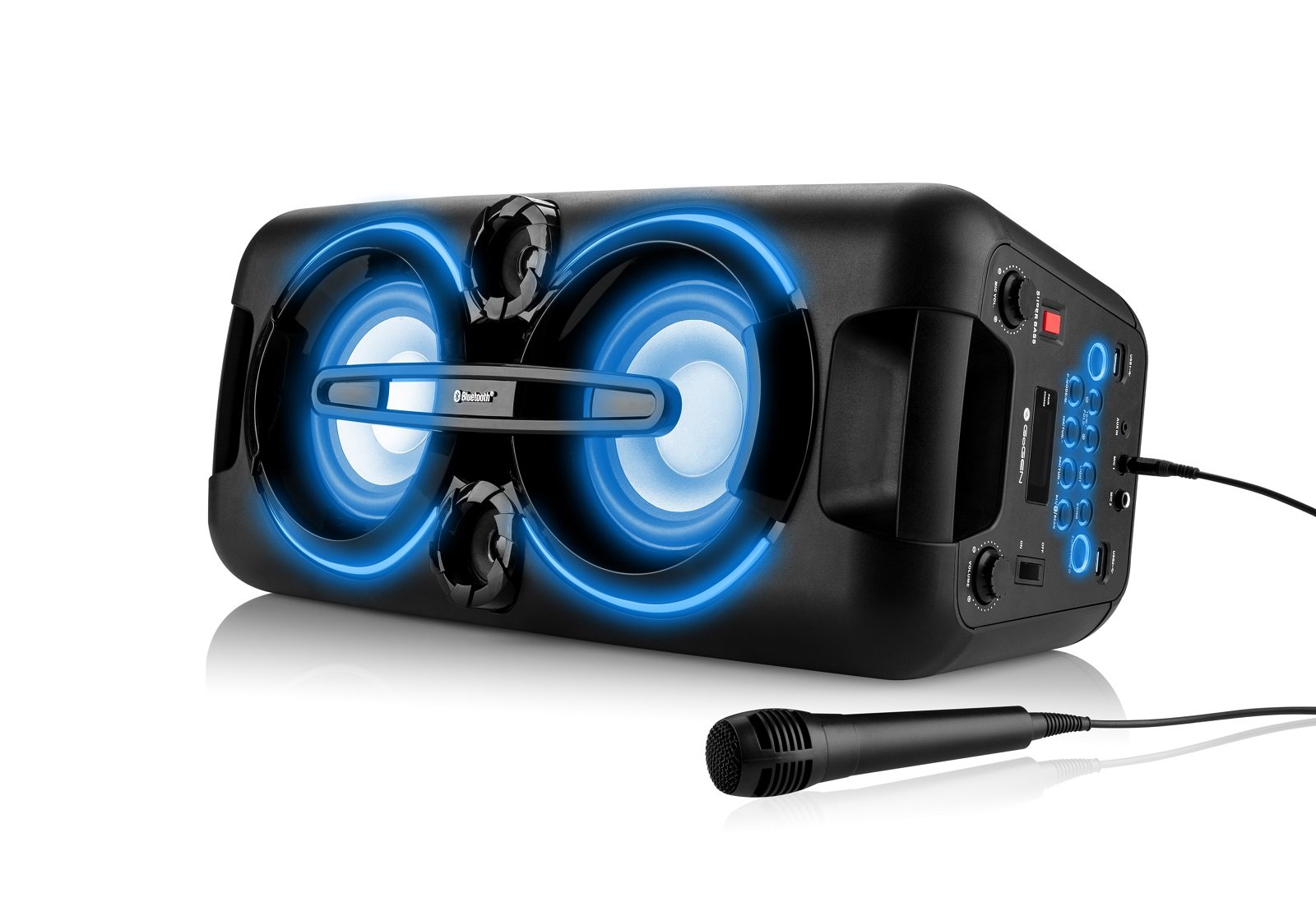 Uwaga na regulację głośności, z mocą wyjściową 2x 30 W podrażnienie sąsiadów naprawdę nie jest problemem. Umie również karaoke, ma dwa wyjścia dla mikrofonów z własną regulacją głośności. Można również dodać funkcję echa (ECHO), którą przede wszystkim kochają dzieci. Jeśli lubisz, "gdy to miga" można urozmaicić muzykę efektami świetlnymi. Ponieważ są to diody LED, baterii nie zużyją prawie w ogóle. |