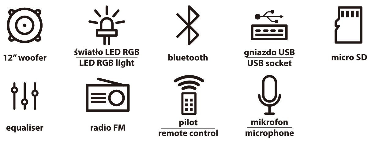| Funkcje dodatkowe: | Odtwarzanie muzyki z karty SD, Odtwarzanie muzyki z pamięci USB, Podświetlenie LED |