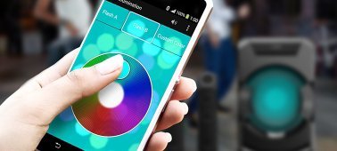 Po zainstalowaniu w smartfonie specjalnej aplikacji możesz sterować zabawą, nie schodząc z parkietu, zupełnie jak przy użyciu bezprzewodowego pilota. Dostępne funkcje obejmują zmienianie koloru diodowego podświetlenia głośnika i wybieranie efektów DJ — bez dotykania sprzętu. |
