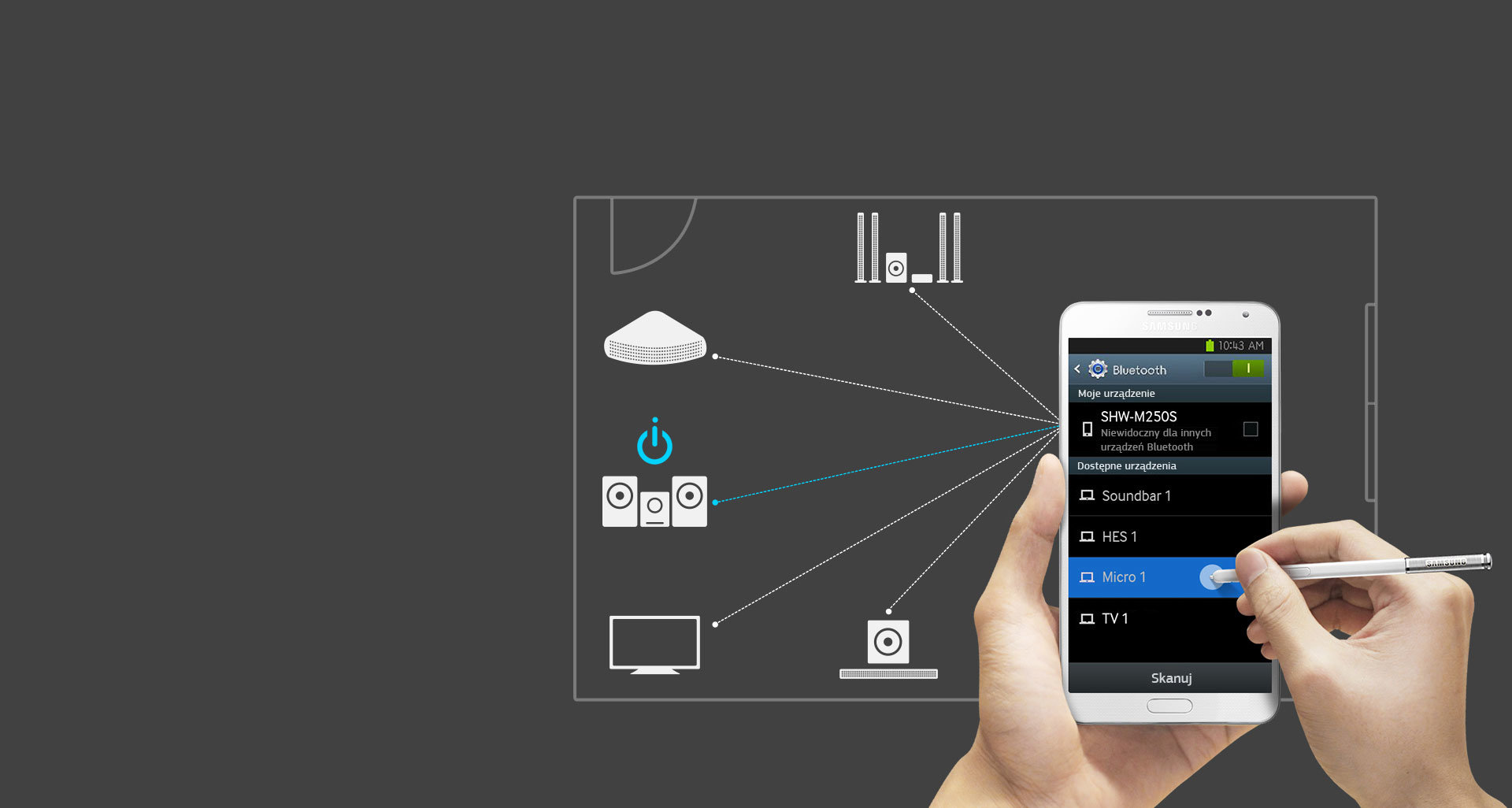 | Bluetooth Power On Dzięki obsłudze technologii Bluetooth możesz włączyć swoją mikrowieżę za pomocą smartfona. Urządzenia musisz sparować ze sobą tylko raz - potem po prostu wybierz mikrowieżę z listy i włącz. Tak niewiele trzeba, by cieszyć się wysokiej jakości dźwiękiem. |