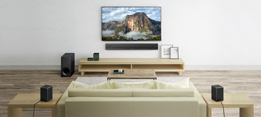 2.1-kanałowy dźwięk przestrzenny z przodu Przetworniki na końcach listwy głośnikowej zapewniają precyzyjne obrazowanie dźwięku oraz wyraźne częstotliwości średnie i wysokie, a subwoofer bezprzewodowy emituje potężne niskie tony.