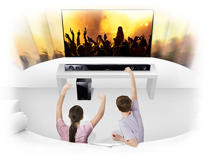 | Dwa razy więcej zabawy z bezprzewodowym łączeniem i udostępnianiem SoundShare umożliwia łatwe podłączenie się do telewizora przez Bluetooth. Dzięki bezprzewodowemu panelowi łączącemu Soundbar z telewizorem zaprezentujesz smukłe i eleganckie wzornictwo obu systemów, zachowując nienaganny styl w swoim domu. W modelach z 2013 roku można sterować urządzeniem Soundbar za pomocą pilota telewizyjnego. Możesz jednocześnie włączyć i ustawić głośność telewizora oraz urządzenia Soundbar przez Bluetooth lub łącze HDMI. * SoundShare jest kompatybilny z telewizorami Samsung z funkcją Bluetooth wyprodukowanymi po 2012 roku. |