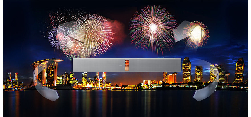 Głośnik Samsung Soundbar sprawi, że poczujesz się jak w kinie. Zadziwiający dźwięk 3D Surround Plus wypełni pomieszczenie dźwiękiem z wszystkich kierunków, oddziałując na zmysły i wprowadzając słuchacza w filmowy nastrój. Trójwymiarowa głębia dźwięku spotęguje doznania płynące z oglądania obrazu w telewizorze, a funkcja Vertical Surround sprawi, że fajerwerki będą brzmieć prawdziwie wybuchowo. Poznaj wyjątkową głębię dźwięku z głośnika Samsung Soundbar.