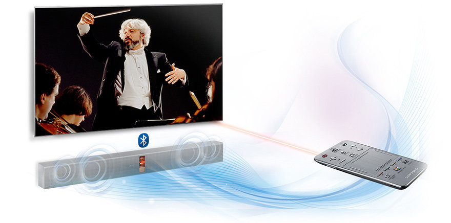 W modelach z 2013 roku można sterować urządzeniem Soundbar za pomocą pilota telewizyjnego. Możesz jednocześnie włączyć i ustawić głośność telewizora oraz urządzenia Soundbar przez Bluetooth lub łącze HDMI. SoundShare umożliwia łatwe podłączenie się do telewizora przez Bluetooth. Dzięki bezprzewodowemu panelowi łączącemu Soundbar z telewizorem zaprezentujesz smukłe i eleganckie wzornictwo obu systemów, zachowując nienaganny styl w swoim domu.
