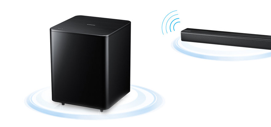 | Moc niskich tonów Połączenie prostoty listwy głośnikowej z oszałamiającym dźwiękiem niskich tonów to gwarancja naprawdę wyjątkowego doświadczenia dźwiękowego. Ultradźwiękowy głośnik niskotonowy dostępny z listwą głośnikową Samsung dodaje do słuchanej muzyki dynamiczne i bogate basy. Brak przewodów ułatwia ustawienie sprzętu i rozmieszczenie go w pokoju, aby poziom basów był idealnie dopasowany. Bezprzewodowa listwa głośnikowa wniesie nową jakość do słuchania muzyki. |