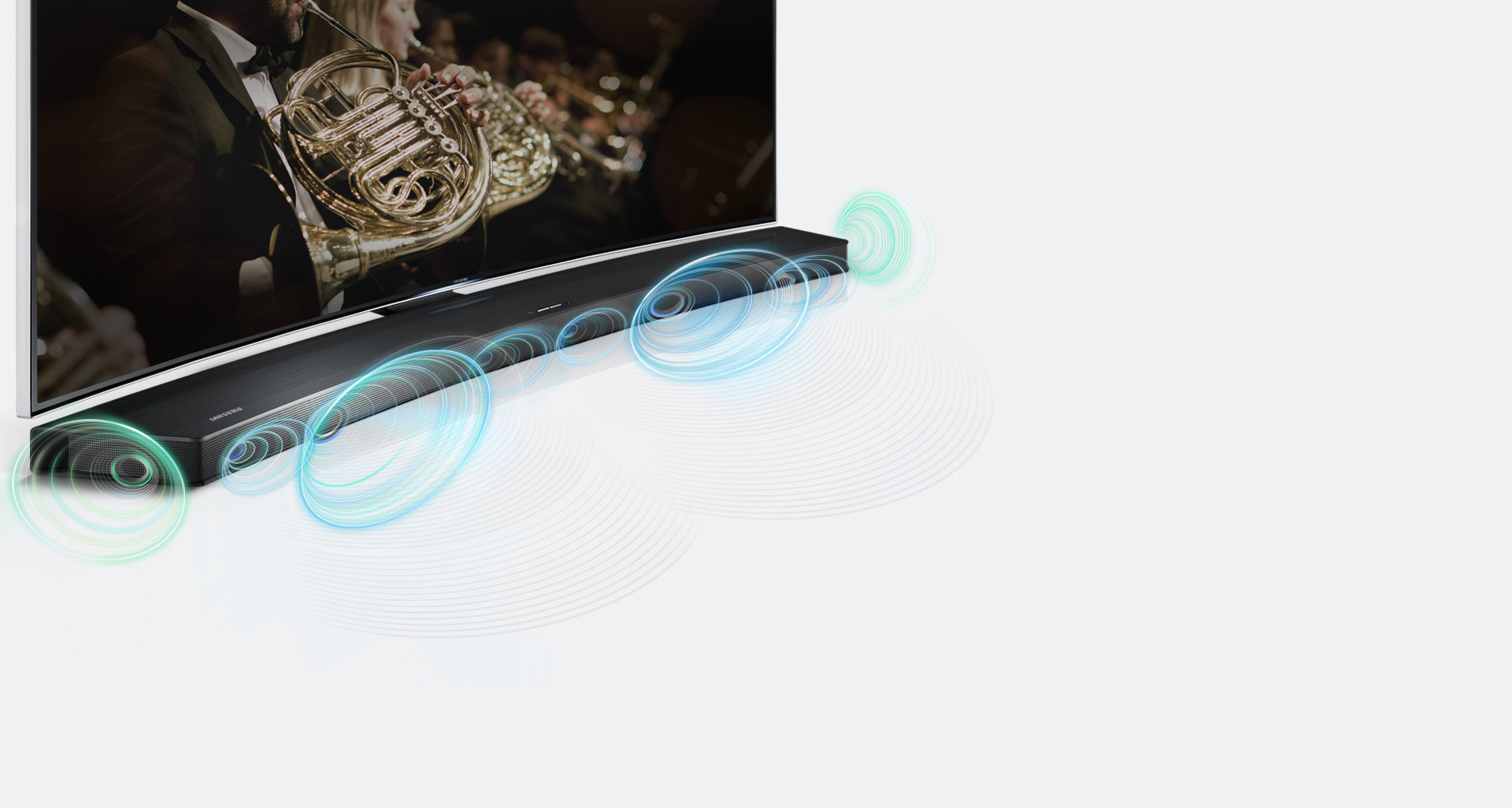 | Stworzony dla zakrzywionych ekranów UHD Podłączenie soundbara do telewizora jest niezwykle proste – i bezprzewodowe. Soundbar odtwarza dźwięk z telewizora dzięki technologii TV SoundConnect wykorzystującej Bluetooth. Pozbywając się dodatkowych kabli w pełni wyeksponujesz nieszablonową stylistykę głośnika. Co więcej, zarówno soundbar, jak i telewizor możesz obsługiwać przy pomocy tylko jednego pilota. * Funkcja TV Sound Connect jest dostępna z telewizorami Samsung 3D wyprodukowanymi nie wcześniej niż w 2013 roku, z wyjątkiem modelu LED F6100. |
