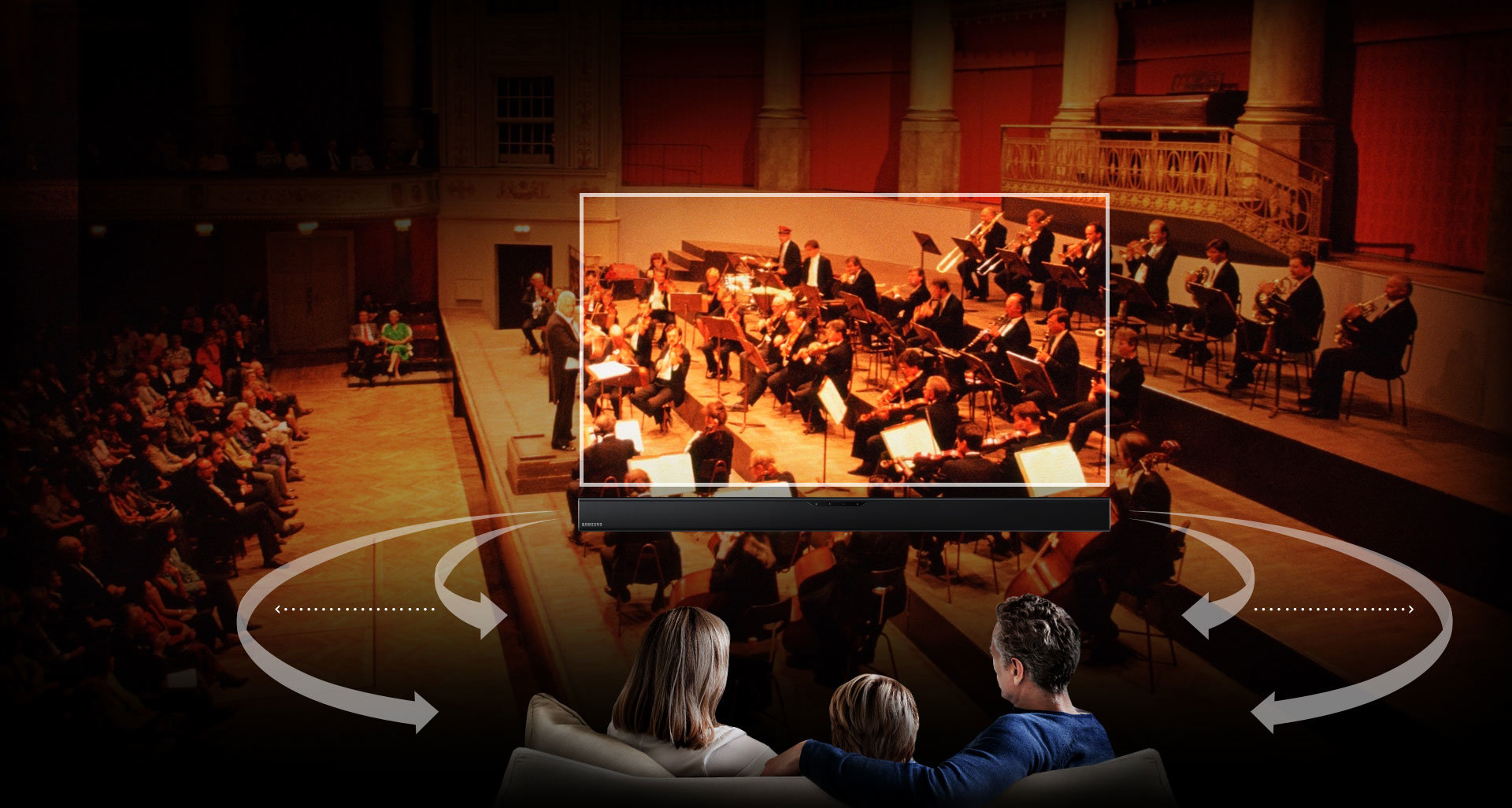 | Realistyczne, przestrzenne brzmienie Funkcja Surround Sound Expansion sprawia, że dźwięk płynący z soundbara ma większy zasięg i unosi się do poziomu ekranu telewizora, eliminując efekt próżni występujący w przypadku standardowych głośników. Dzięki temu dźwięk charakteryzuje się większą głębią, a Ty masz wrażenie, że pochodzi prosto z telewizora. |