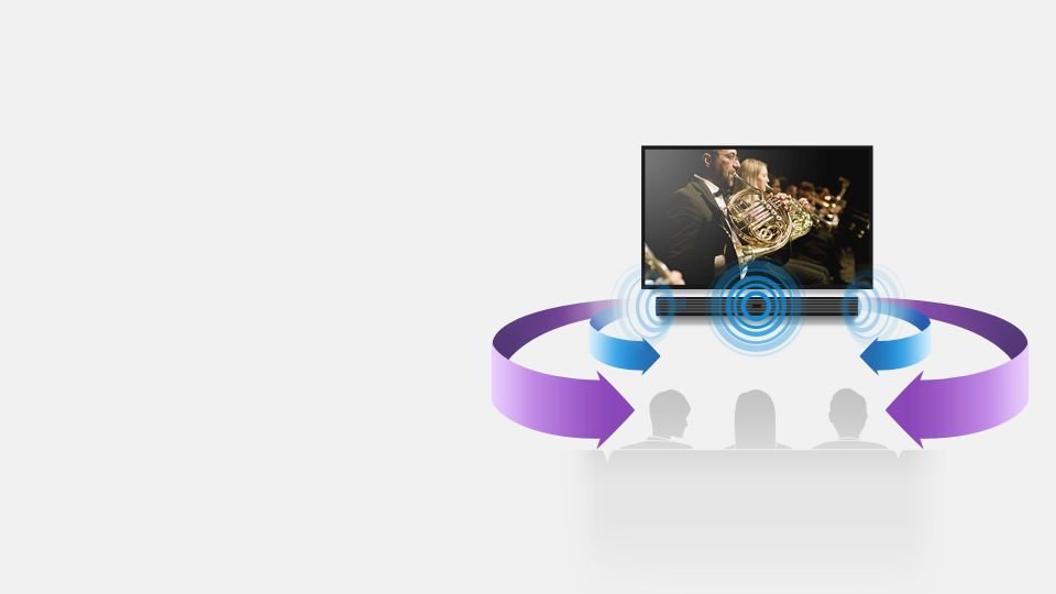 | Udoskonalony efekt dźwięku przestrzennego Funkcja Surround Sound Expansion sprawia, że dźwięk ma większy zasięg i unosi się do poziomu ekranu telewizora. Dzięki temu charakteryzuje się większą głębią, a Ty masz wrażenie, że pochodzi prosto z telewizora. |