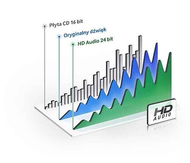 dźwięku w jakości HD Ciesz się realistycznym i zwiększającym emocje dźwiękiem wybierając urządzenia audio odtwarzające HD Audio. Dźwięk w jakości HD zachowuje bogactwo oryginału poprzez zastosowanie próbkowania 192 kHz/24-bit. |